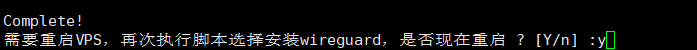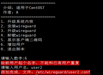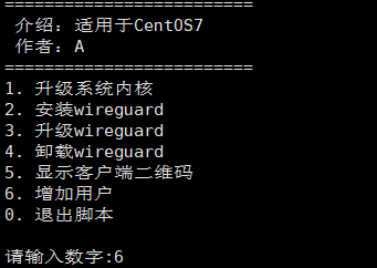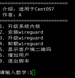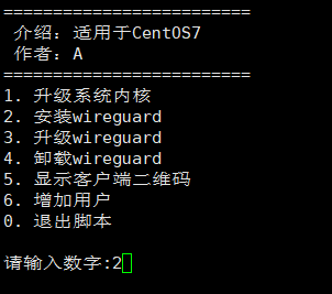 注意:先输入数字1升级CentOS7系统的内核,升级完成后重启服务器,之后再运行脚本,输入数字2来安装wirguard。