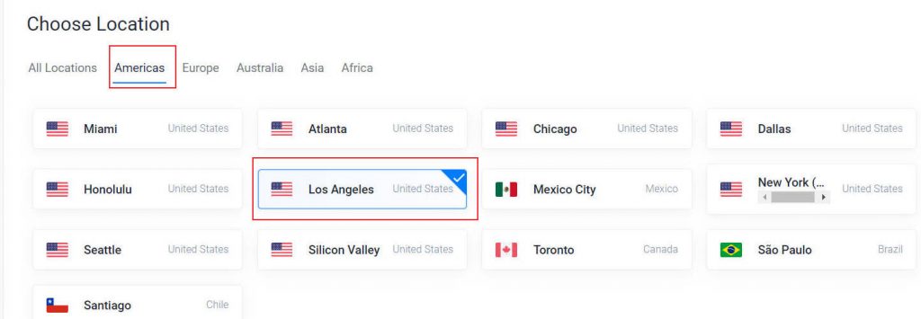 选择服务器位置。不同的服务器位置速度会有所不同,有的服务器的最低价格会不同,一般纽约等位置的价格最低,有3.5美元/月的,可根据自己的需求来选择。推荐洛杉矶服务器,延迟较低且比较稳定。