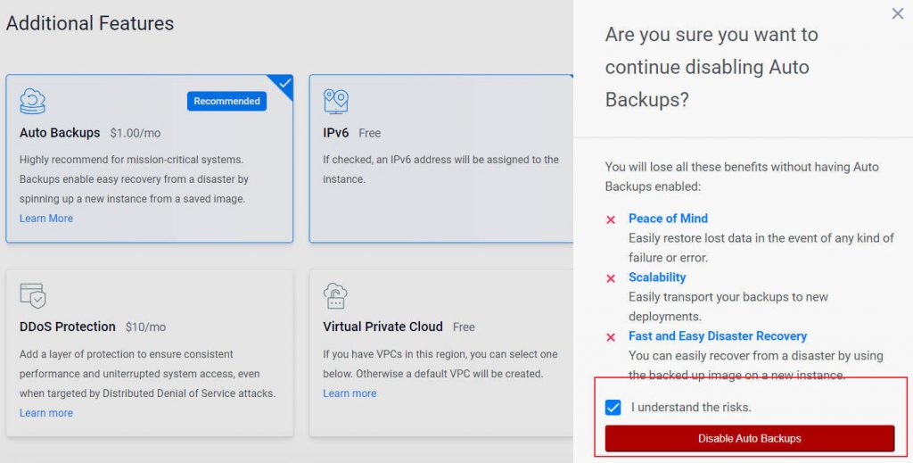 关闭自动备份Auto Backups,这个是收费的。点击它,在右侧的I understand the risk前面选择勾,然后点击Disable Auto Backups即可关闭自动备份。